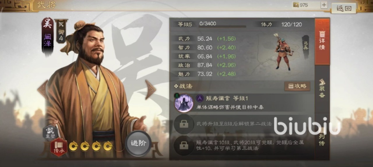 除此之外,阚泽并没有内政相关的技能,也没有同队加成,所以也只有输出这一条路了,好在自身技能还不错,用来作为传承战法为橙将补充技能即可。
