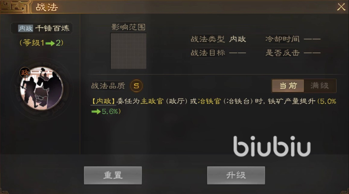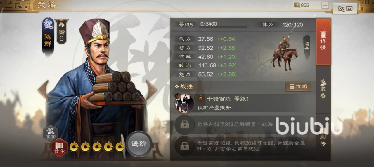获取之后一般来说不会将其放到队伍中去战斗,而是应用于内政方面,这和自己属性与技能是分不开的。属性方面政治极高,这就带来了很高加成,自带战法千锤百炼,当被委任为主政官或者是炼铁官时候,己方铁矿产量按比例提升。小编的建议是直接委任成炼铁官,这要是节省出来的主政官职位可以安放更加合适人选,毕竟提升铁矿产量是一定的。铁矿是所有资源中非常珍贵的一种,前期非常紧缺,有了陈群的帮助就能减缓资源上的压力,尤其是后期百分比提升也是极其可观的数字。