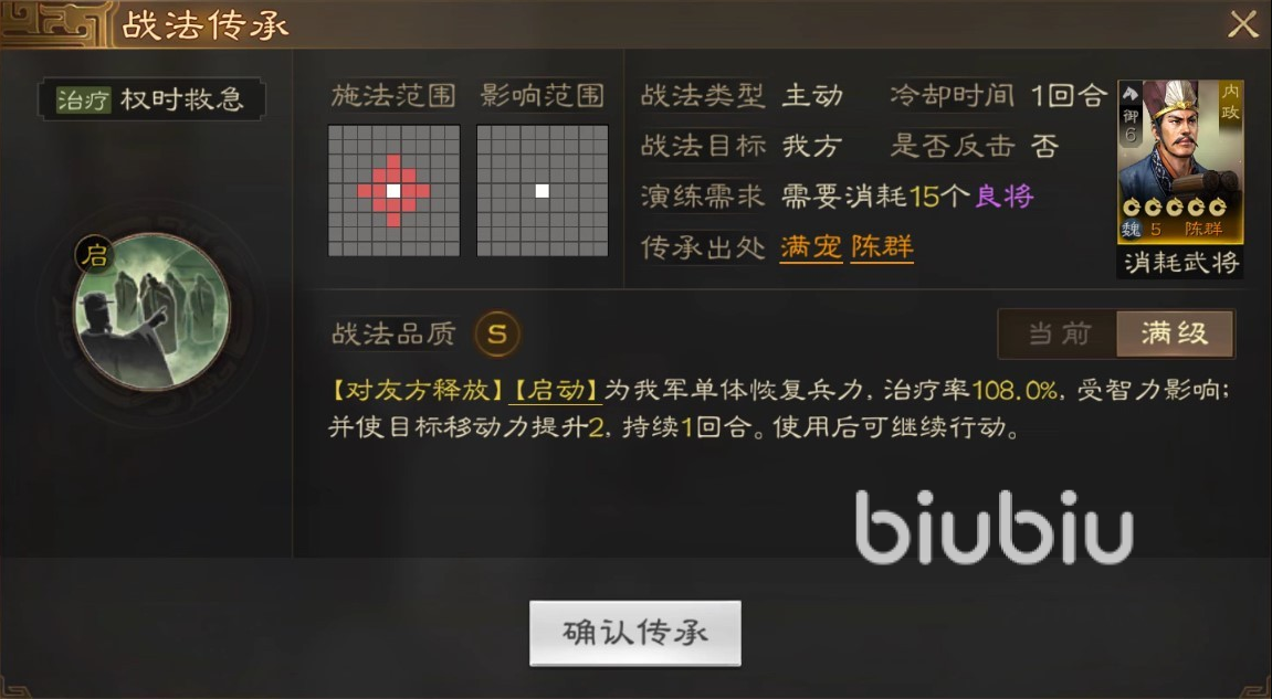 除此之外,还可以将它分解之后获得传承战法,效果是为我方单体目标恢复兵力,并且提高移动力,有了这两项效果,就使得此战法成为了非常强的单体辅助。提高移动力对于战斗布局来说是非常关键的,尤其是一些需要近战输出的武将更是如虎添翼。