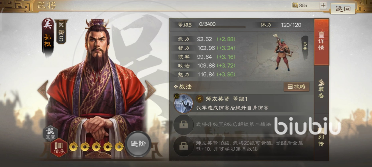 抽到孙权之后,接下来要研究的就是属性、技能以及实战中搭配和定位,毕竟花费大量道具所获取的武将不能毫无用处。从属性上来看,所有5种属性都非常出色,没有明显短板,尤其是关于战斗的前三种属性上更是达到一流水准,这也就使得孙权完全拥有成为阵容主力的基础。自带战法是一项比较复杂的技能,首先来看被动效果,当我方任意一名武将造成伤害之后。孙权都能获得对应属性伤害提升效果,此增益状态可以叠加,主动释放时可以将这些增益状态分给队友。