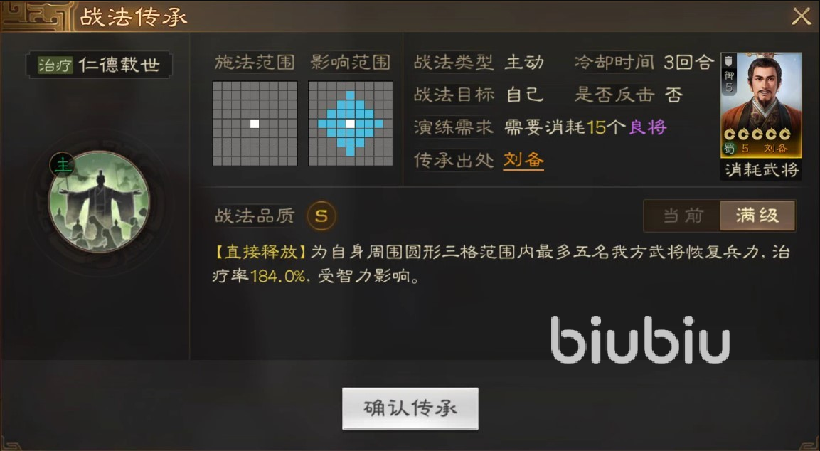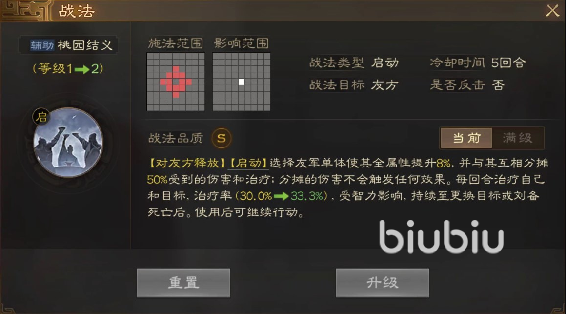 自身战法,桃园结义是一个非常强势的辅助型技能,使用之后选择一名目标将其和刘备连接起来。双方共同分享受到的伤害和接受治疗,并且持续恢复兵力,此外对方全属性也获得提升。这对于辅助单核来说是非常关键的技能,所以在阵容搭配方面选择关羽,张飞,和刘备一起组成小队就成为最佳选择。另外还有一项用处就是将其分解掉获得传承战法,这也是一个很好用的辅助类技能,可以群体恢复兵力,效果极其强悍。