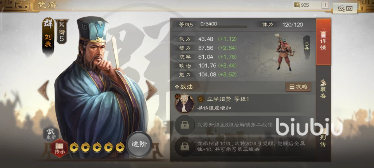 再看一下自带战法方面的属性,作为主政官时候提高寻访速度,寻访是后期获得很多关键道具重要途径,而寻访最大限制就是在速度上,没有太多提速道具。而利用战法来加速就成为最主流做法,所以后期如果要想通过寻访来尽量多获得利益,刘表是绝对要获取的武将。而且无论是前、中、后三个时期都能发挥出作用,所以无论何时获取此角色都不算晚。