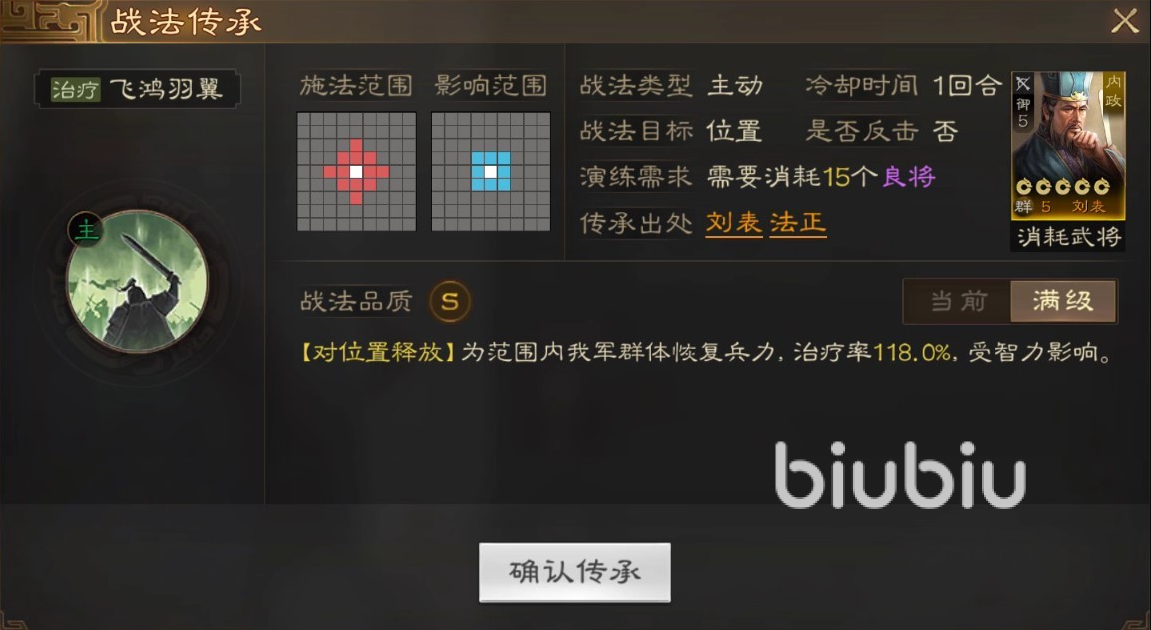 但是此角色消耗卡牌数量并不多,出战型武将可以提高品级,但是刘表却没有这样的需要,所以多余卡可以用来传承出战法。传承之后获得一个极其好用的群体恢复型技能,所有智力型辅助武将都可以选择,能够为大范围友军恢复兵力,适用范围极其广泛。在极端情况下,如果确实缺少出战人选,刘表也可以自己选择自己的传承战法,然后搭配上其他技能充当替补。