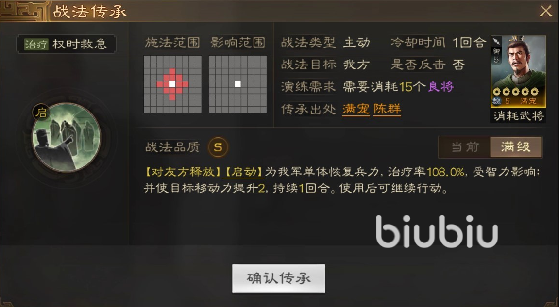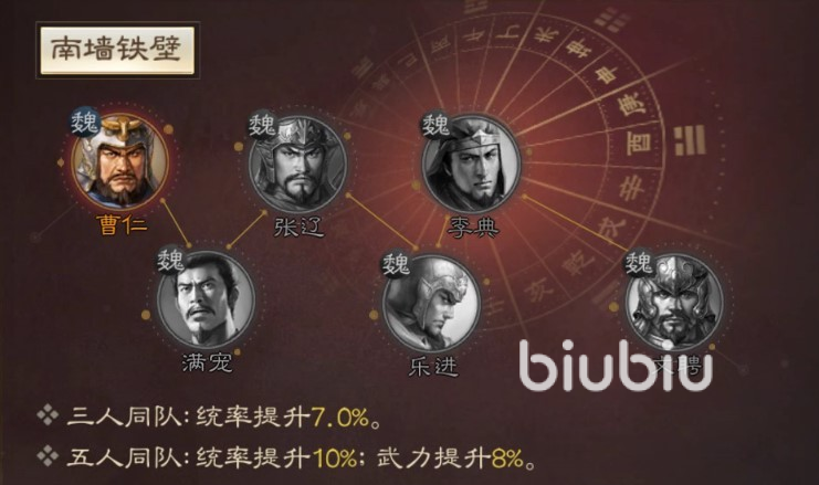 阵容组合方面最佳搭配队友选择是曹仁,张辽,乐进,李典,文聘等,视抽取情况自由组合。只要有5人一同出战就可以获得统率值和武力值提升优势,在所有羁绊属性中也是极其可观的一类,而且这些角色在获取上并没有太大的难度,成型速度非常快。如果运气好重复抽取到这名武将,小编建议是先拿出一张来获得传承战法,然后自己学习。战法效果同样是为单体进行治疗,并且附加移动力加成。和自带技能可以很好结合起来强化辅助能力。