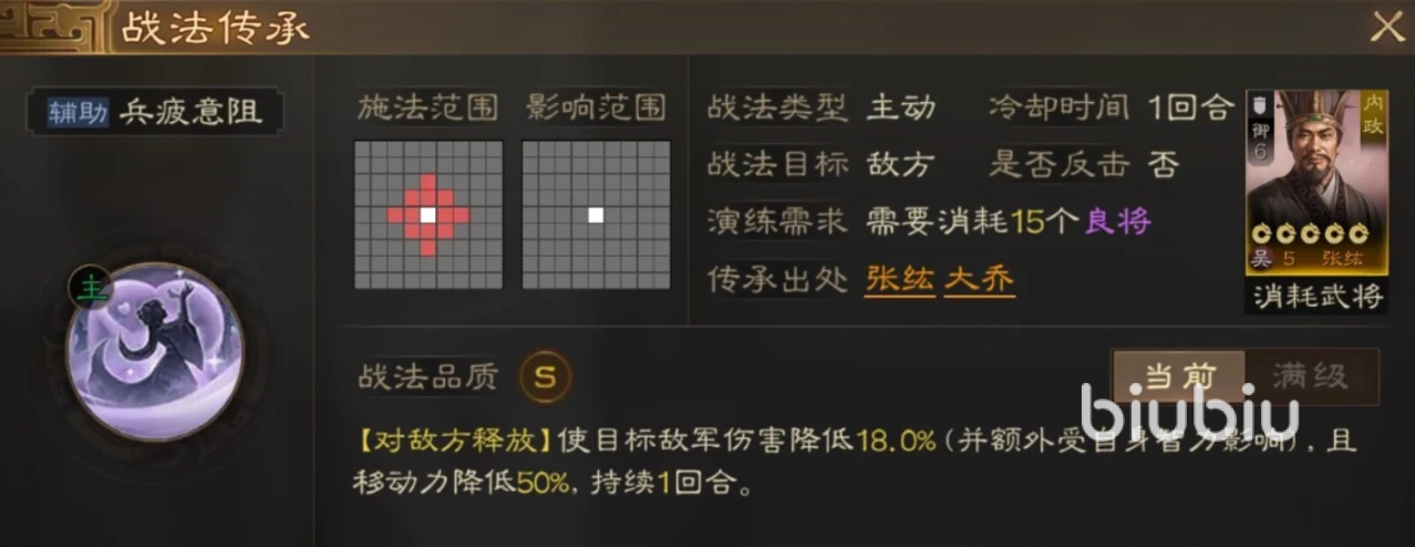 技能战法输出不高,可以让敌方团队的伤害和速度降低,主要就是用于辅助战斗,在牵制战中能发挥不错的作用,就是这个技能就不要升级了,毕竟只是作为控制使用,提升技能伤害没有必要,顶多就是附加一些特殊性的技能效果。