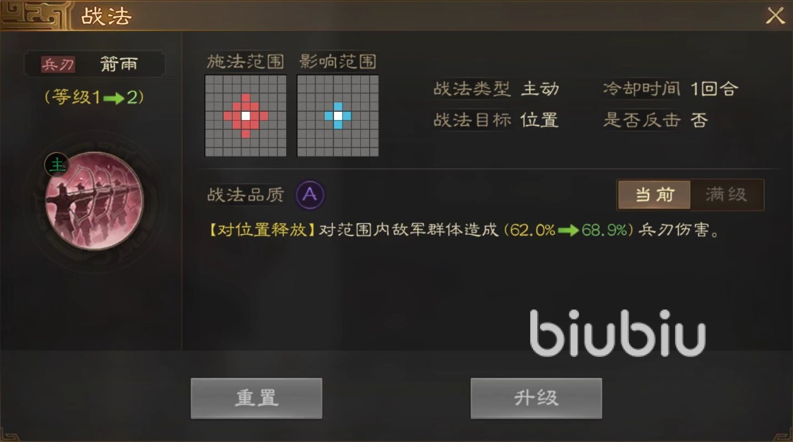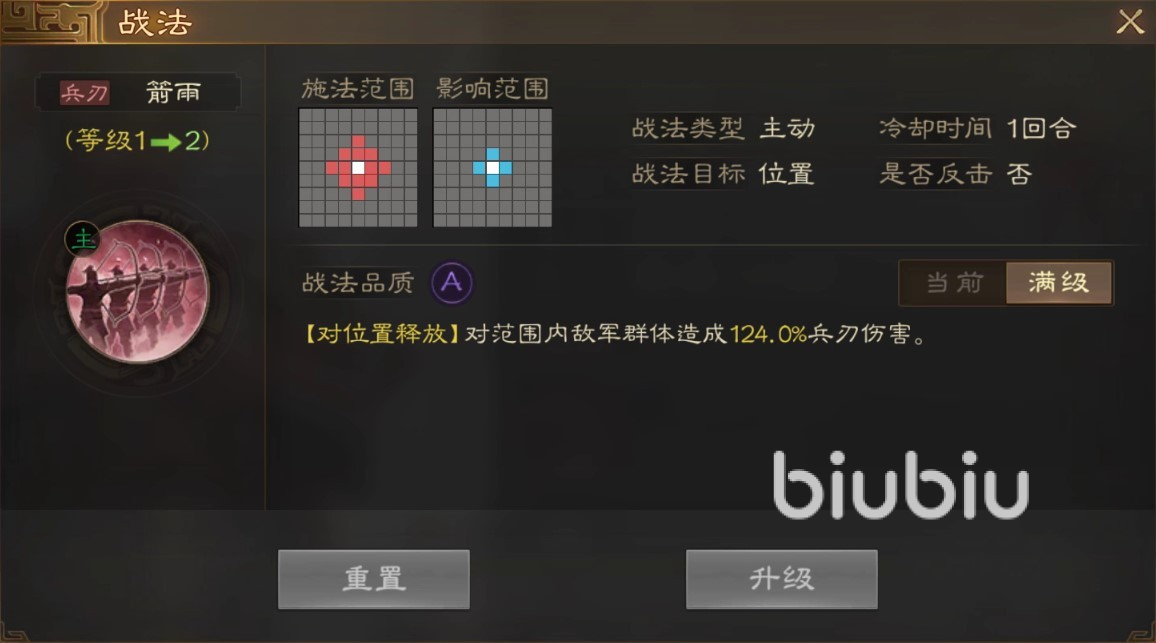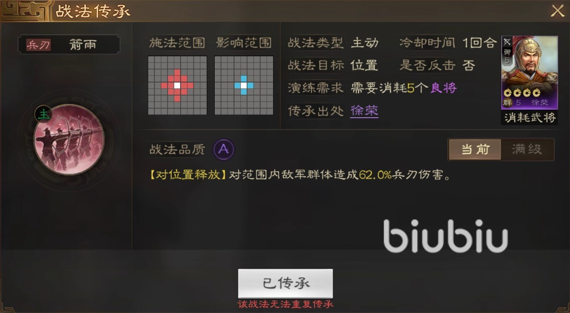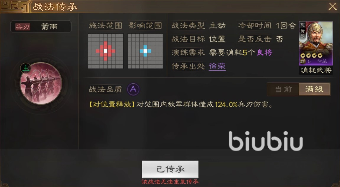 徐荣的战法品质属于A,从面板来看,箭雨为直接伤害类战法,简单理解为直接造成伤害,作战效果来看,弓兵以远程消耗为主,自身伤害可观,对战骑兵有一定奇效,相反对盾兵的效果是被克制,所以在对战中需要结合徐荣自身的优势打出更快更有效的战斗。同时徐荣提供直接范围伤害,总体战法表现良好。