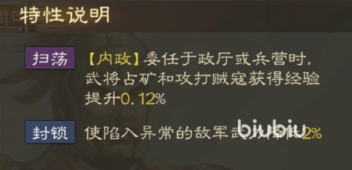 特性方面徐荣的特性使陷入异常的敌军武力有所降低;委任方面在政厅或兵营,武将占矿和攻打贼寇获得经验小幅提升。
