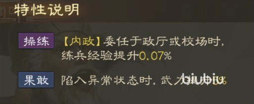 不过因为其有文官背景,加上又兼具武力经验,所以在被动上拥有操练的特性,可以在内政玩法上委任他去主政厅或者校场当值班武将,可以稍微的提升练兵经验。
