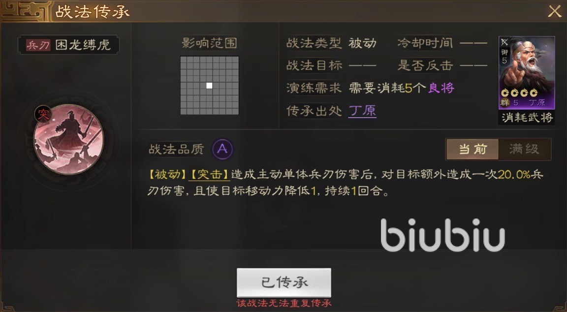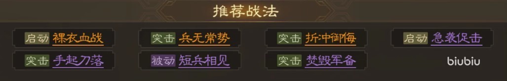 因为背景设定善于骑射,所以被定位擅长带弓兵。不过战法的名字很帅,叫困龙缚虎,可以对面前敌人平A的兵刃伤害时,额外触发一次百分比伤害,并且会降低敌方的移动力,也就是走的格子更少,这样敌人更容易被远程单位在远处击败。