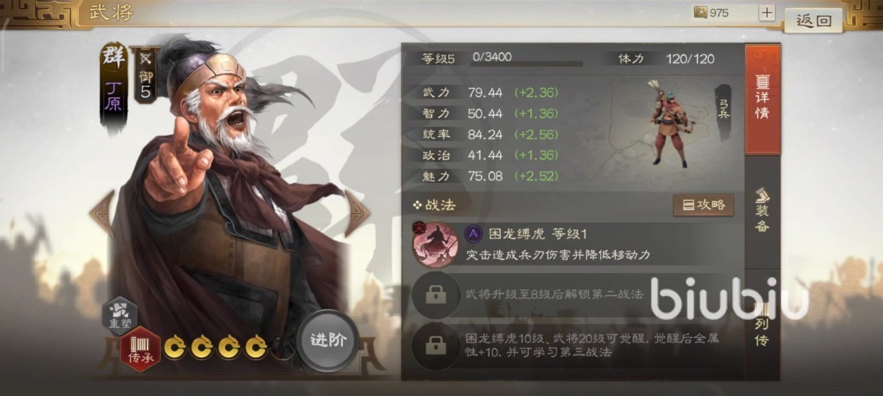 然而剩下的特性果敢需要丁原在陷入异常状态时才能触发,提升武力,这个要求相对有些苛刻,说白了就是鸡肋,所以整体水平一般。以上就是三国志战棋版丁原的介绍,这个武将在队伍搭配上比较灵活,但可替代的选项也非常多,过渡类武将大家按需来选吧。