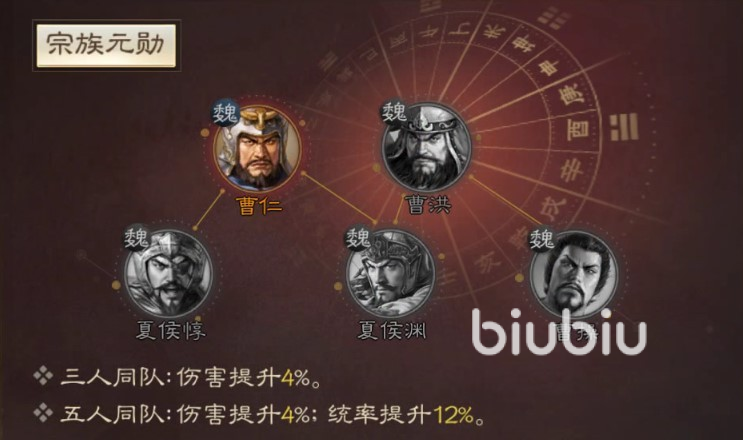 同队加成方面,其名为宗族元勋,在曹仁,夏侯渊,夏侯惇,曹操中,有三人同队伤害有所提升;五人同队伤害统率都会提升。