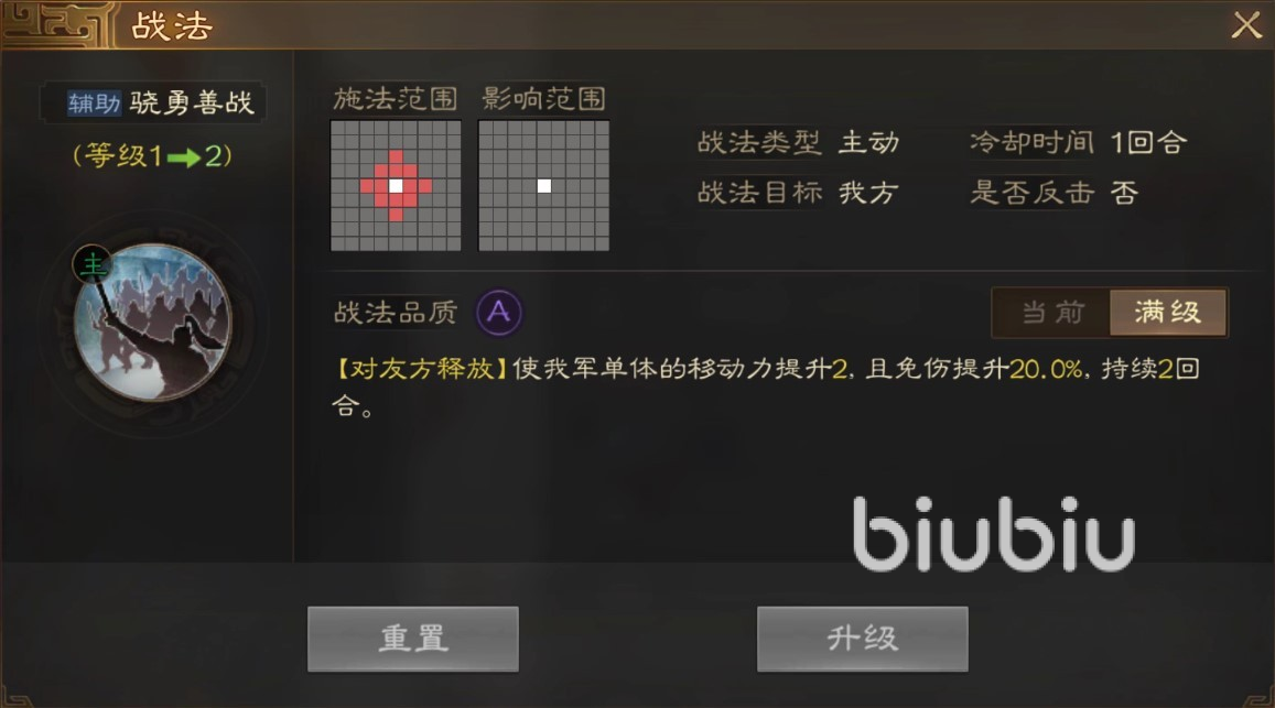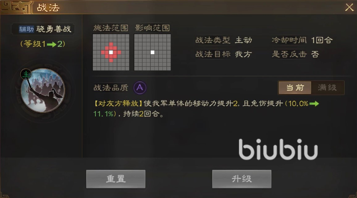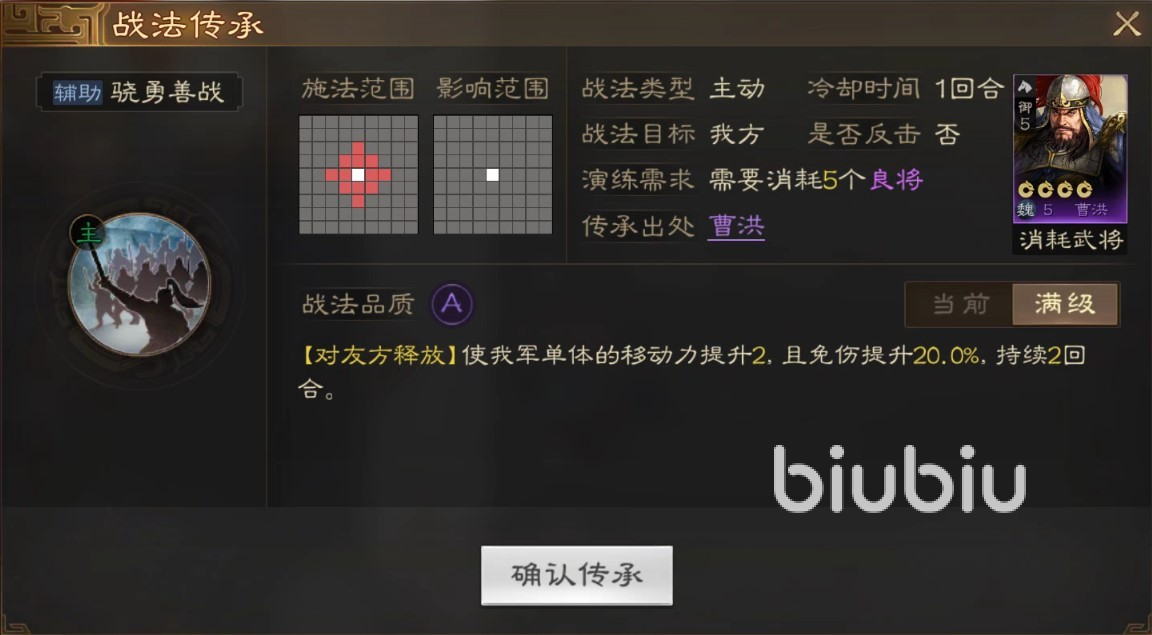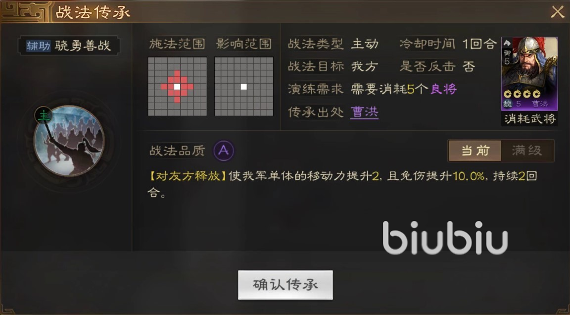 曹洪的战法品质属于A,从介绍来看,骁勇善战为增益类战法,简单理解为加速免伤,影响范围圆形三格,曹洪提供伤害减免效果,作战中能抗能打。