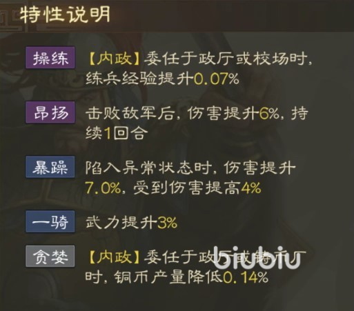 特性方面曹洪的特性武力,伤害大幅提升,持续一回合;处于异常状态时,伤害提升受到伤害也会提升;委任方面在政厅或铸币厂,铜币产量降低,可以说很贴近曹洪贪金的秉性了。