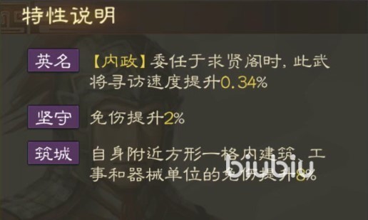 特性的英名可以让孙桓入驻求贤阁时提高些许寻访速度,另外两个特性,一个是自身的免伤,一个是周围建筑和器械的免伤提升,适合一些特定阵容。