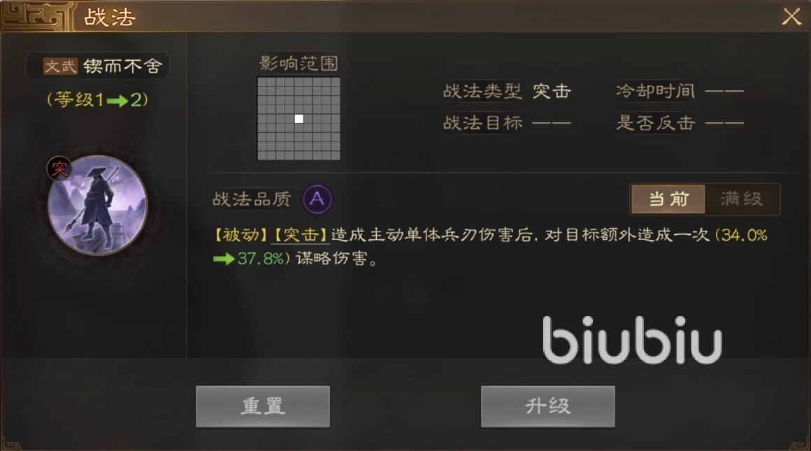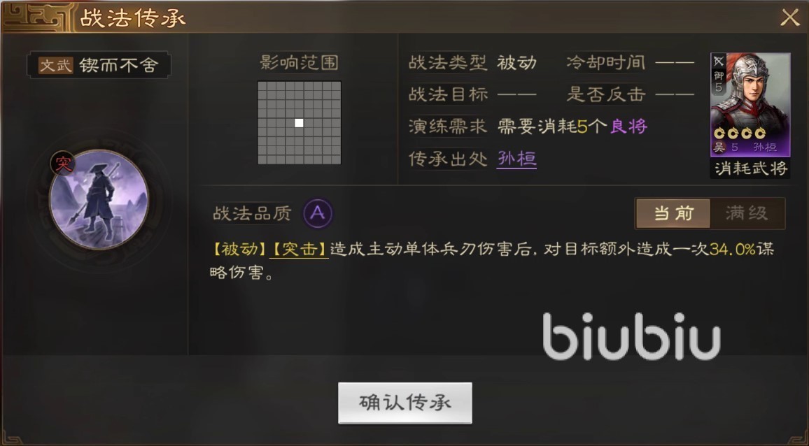 传承战法同理,锲而不舍给到那些文武值都高的橙将,前期是可以一用的,不过机制本身比较简单,后续有S级战法还是得换掉。