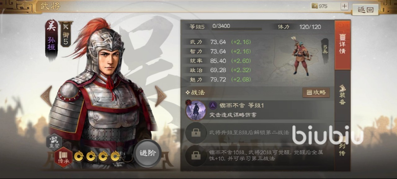 战法方面,孙桓战法名叫锲而不舍,属于被动的突击类,在用平A攻击后,会触发一次额外的谋略伤害,可以理解成物理攻击附带魔法伤害,孙桓本身的武力和智力都属于合格线上的水准,所以以此影响的两种伤害性质表现都还行。