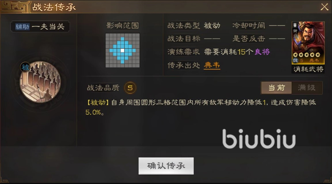 如果选择传承,那么将获得战法一夫当关,同样是一个防守型技能,降低周围敌人移动力和伤害。此技能虽然是肉盾专属,但小编认为并不适合典韦选择,为了不浪费其超高武力值,战法搭配方面依然以偏输出为主。因为自身没有其他羁绊效果,所以对有选择方面小编推荐加入到魏国现有阵营中,和曹操、张辽、甄氏等一起组队,充当团队肉盾。