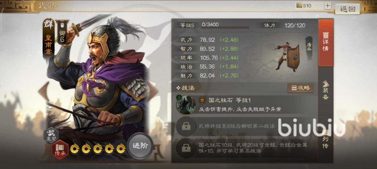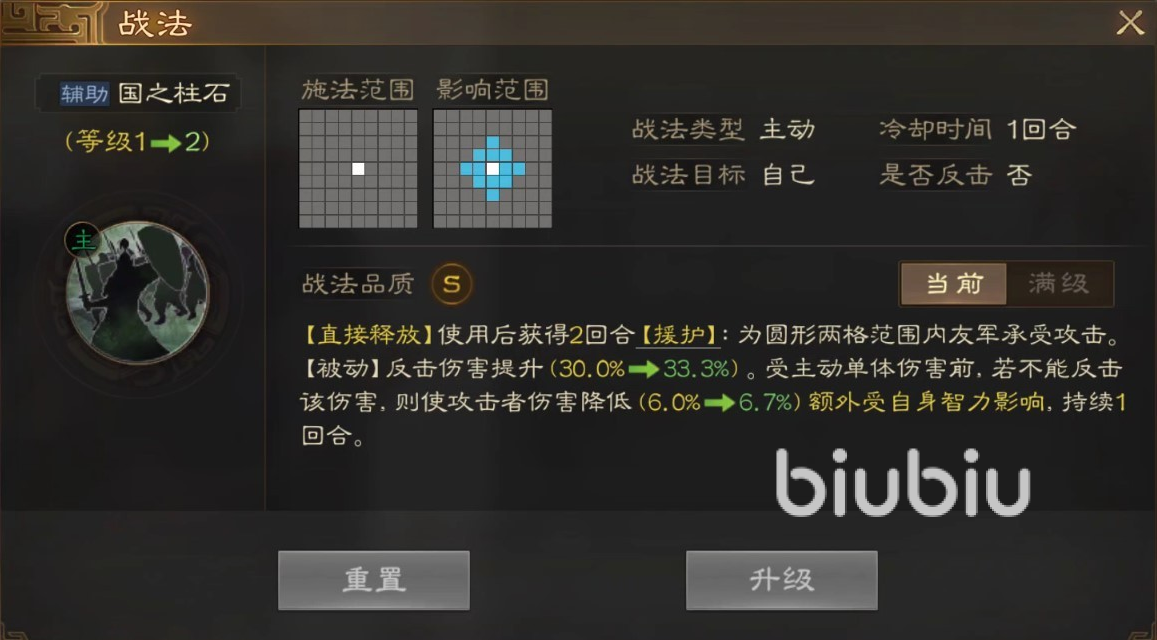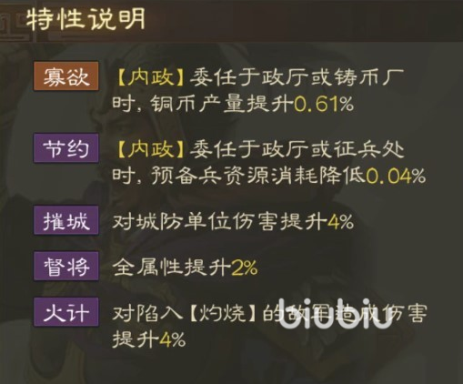 在属性方面输出并不可观,但是统率值比较高,这是非常出色的地方,也说明了该角色在防御上将会有很好表现。自带战法也说明了这一点,在使用之后将会获得持续两个回合的援护状态,可以为周围友军承担伤害,这一点和魏阵营里的曹仁非常相似。同时还具有被动效果提高反击伤害,如果没有成功触发反击,则使攻击者伤害降低。