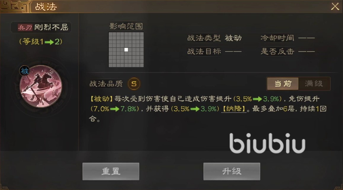自带战法特点是在受到伤害时能够叠加状态,可以提高自身免伤属性和造成伤害输出以及获得纳降效果。纳降状态就是通过攻击可以将伤害转化为兵力恢复,相当于自己具备了吸血能力,这样变相提高了在前排扛伤害的硬度。叠加起来免伤和伤害能力可以,最多达到6层。所以该角色特点就是需要在前排充分吸收伤害,然后叠加起来打防守反击。