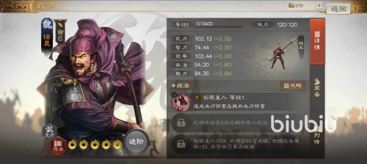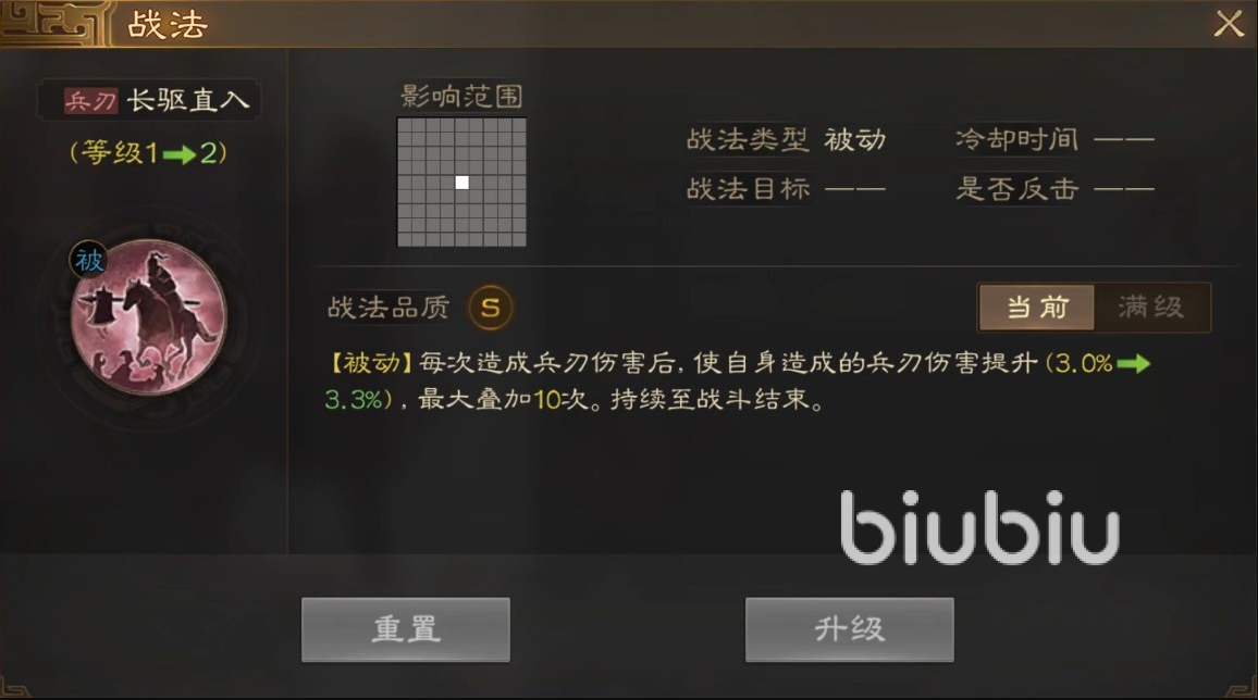 之所以建议大家入手这名武将,是因为他在输出方面确实有独特之处,不仅自身武力值非常出色,自带战法也是超一流输出技能。每次造成兵刃伤害后,自身都能获得一次兵刃伤害提升的叠加效果,最多可以叠加到10次,持
