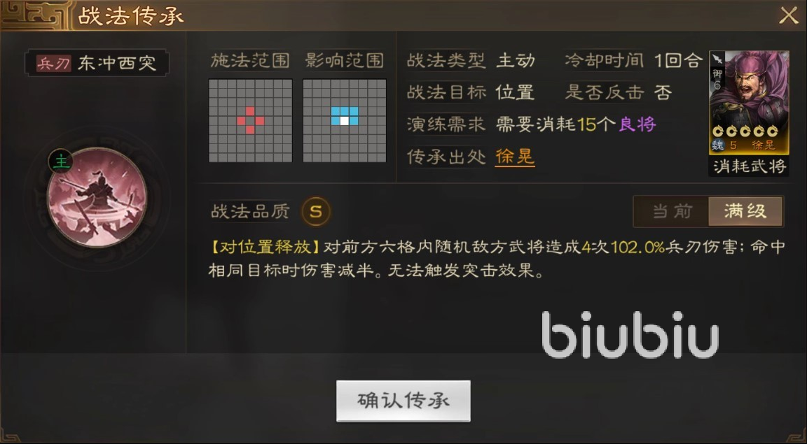 如果能够再次抽到徐晃卡牌,小编的建议是分解一张获得传承战法,效果是对前方武将随机选择目标造成群体伤害。自身学习之后既有了单体输出又有群伤,将叠加之后的伤害最大化。在阵容搭配上,曹操、张辽、于禁等都是非常好的队友人选,三人同队时提高武力输出,进一步强化伤害。也可以适当加入一些治疗,这样可以增加续航能力,毕竟后期才是发力的时候。