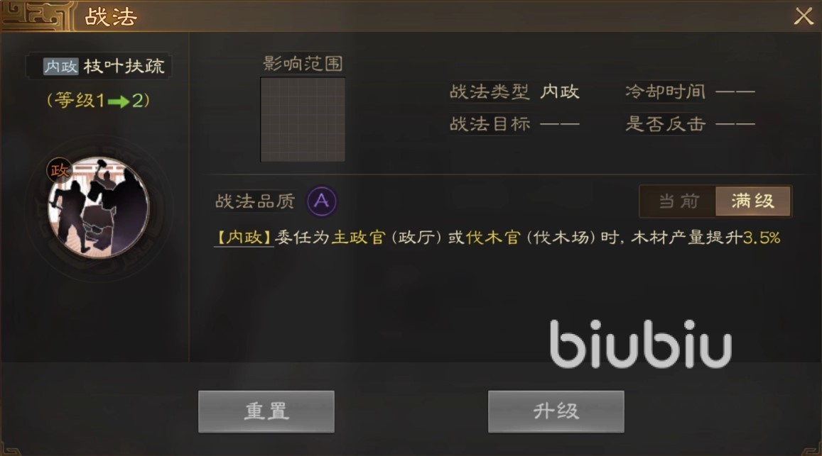 所以这个角色的在智商的战斗能力方面,并没有太大的偏差。然后要了解的是他的技能,此处它的技能定位是内政,也就是说其作用并不是用在战场上的,主要的功效就是在角色任职为主政官或者是伐木官的时候,能够额外提升木材的产量。