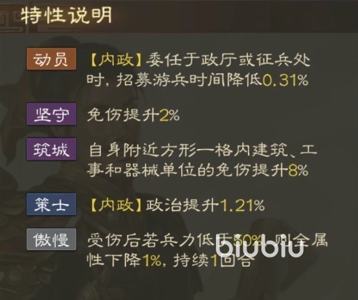 而这个能力就有点像每个角色都会有的特性系统,就比如当他在政厅或者是征兵处工作的时候,这里招揽兵员的时间会更快。在对局中他身边的建筑或各种设施的免伤加成会得到额外的提升。