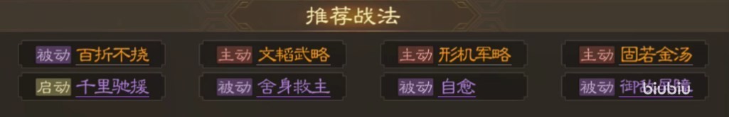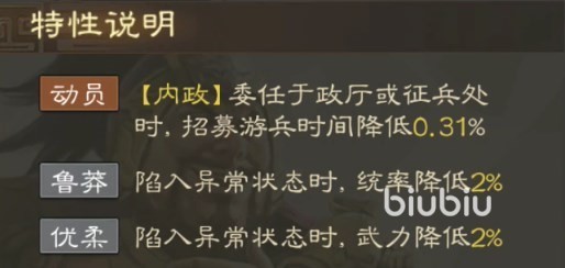 除了技能以外,他还有三种特性属性,其中一个的效果是在其任职与政厅或者征兵处的情况下,可以降低招募游兵的时间。另外两个是在角色进入负面状态的时候,就会降低其统率数值和武力值,由此可见后面两个都是不好的能力。所以大家在使用的时候要注意一些。