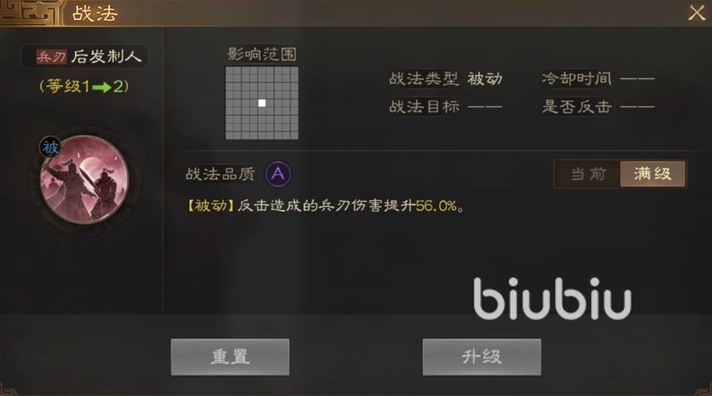 这个战法还是被动型的,在一级的时候,主要作用就是能够将反击产生的兵刃伤害进一步提升,这里可提升的数值最高为百分之三十一。而在满级的时候这里能够提升的数值达到了百分之五十六。