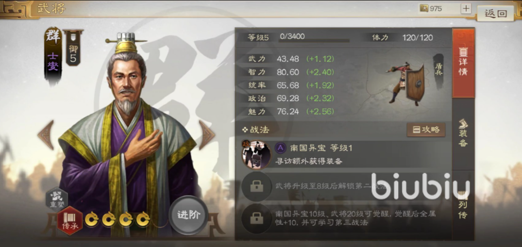 士燮这个角色算不得名将,在群雄的行列当中,这个角色的稀有程度不高但是属性上还是比普通程度的兵要高很多的。咱们可以看士燮的智力属性是他的五种属性内最高的,因此玩家如果想要使用一定要了解清楚这个角色的定位。