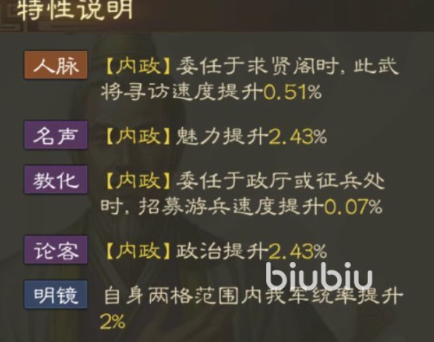 这个角色在特性上就只适合在朝堂内给玩家出谋划策,不仅可以提升美丽还有助于玩家政治的快速提升在招兵速度方面也会得到额外的数值。