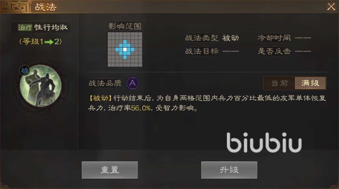 向宠在游戏里统率骑兵,5维属性也比较均衡,尤其是统率的属性值比较高。人物自带战法“性行均淑”可以在行动结束之后为自己两格范围内兵力百分比最低的单位恢复兵力,治疗率收智力加成影响。而在战斗向的武将中向宠的智力属性算是比较高的。