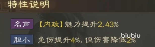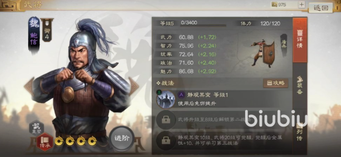 还是老样子先从鲍信这个角色的数值来看,鲍信作为魏国战将属于盾兵的一种,在五项数值内并没有特别突出的,只有魅力值稍微比较好。其余的数值就可以说非常的平均,因此玩家们不要看到这就鲍信这个角色没有用,咱们再往下看看。
