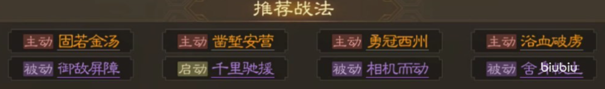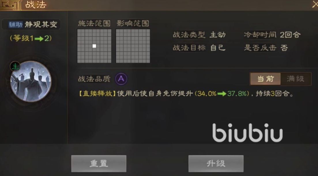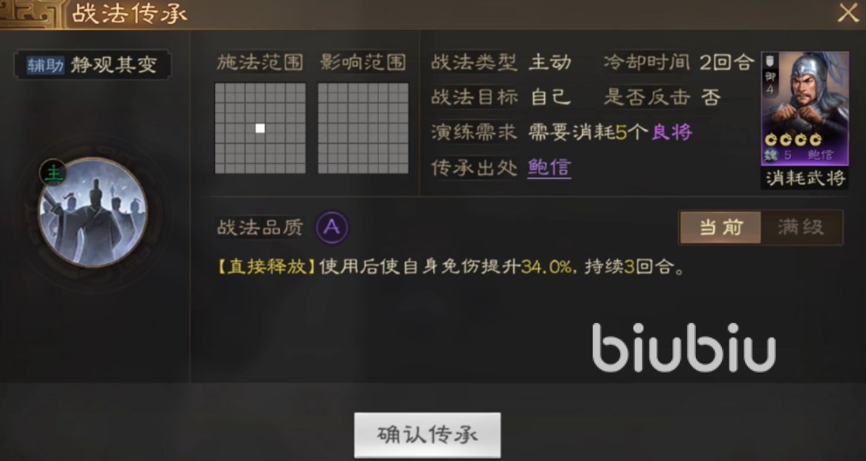 鲍信自带的战法名叫静观其变,这类战法在游戏当中归属于辅助类,主要的作用在于释放之后可以提升自己的免伤能力并且最高可以持续三个回合。虽然技能释放之后需要冷却两个回合,但是这并不影响角色作战时期。