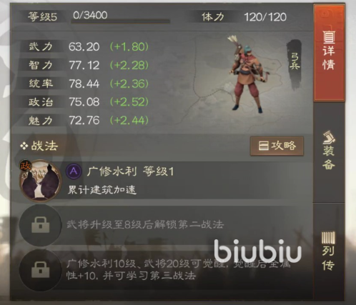 首先先说一下刘馥的面板,他是一位紫色品质的魏国武将,上限为四星,其五维在紫色武将里面来看还是比较高的,平均有2.3以上,部队方面的话他有着弓兵的部队配置,不过这个不关键不用太在意,具体什么原因往下看就知道了。