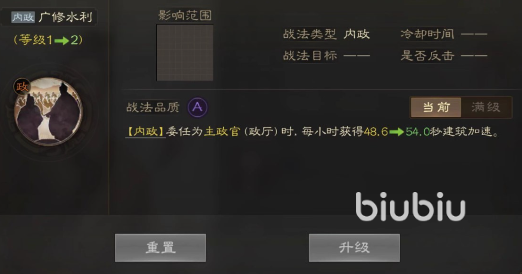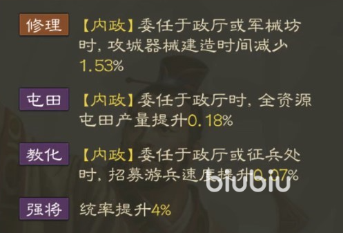 说明原因之前要先给大家说一下这名武将的战法配置,首先是自带战法,他的自带战法是一个完全内勤用的内政战法,效果是获得建筑制造加速,最高可以提升54秒,这个战法完全无法用于战斗,传承战法和自带是一个属性都是建造加速不过传承战法满级以后可以最高获得97.2的加速度,这么看来刘馥只能做为后勤不能出现在正面战场上。