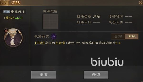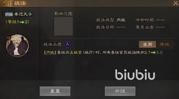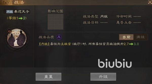 他的技能叫做奉迎天子,这个技能是一个专项于内政的战法,当它为一级的时候,能让其他的所有官员的政治都提高2.7个点,这个战法它是一个a品质的战法,若是大家在后期给他进行升级,达到满级的时候,所有官员的政治水平则会提高5.4的点。