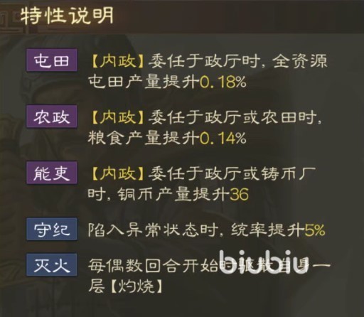 而在战斗方面,被挂上debuff的时候能提高5%的统率,算是略微提升了一点坦度,而且每个偶数回合都会驱散身上的灼烧buff,如果遇到东吴火烧队能稍微应付一下。