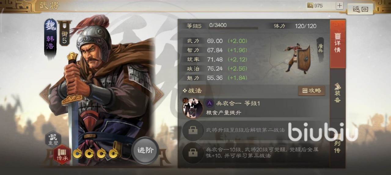 韩浩统领盾兵,全方位属性没有特别突出的,但也没有哪一项拖后腿。自带的战法是内政倾向的,作为主政官或者粮草官的时候,可以提升最高3.5%的粮食产产量。所以他并不是一个战斗向的武将,更多是内政取向。这一点倒是和历史很相符,历史上闹饥荒的时候,韩浩就建议屯田救荒。