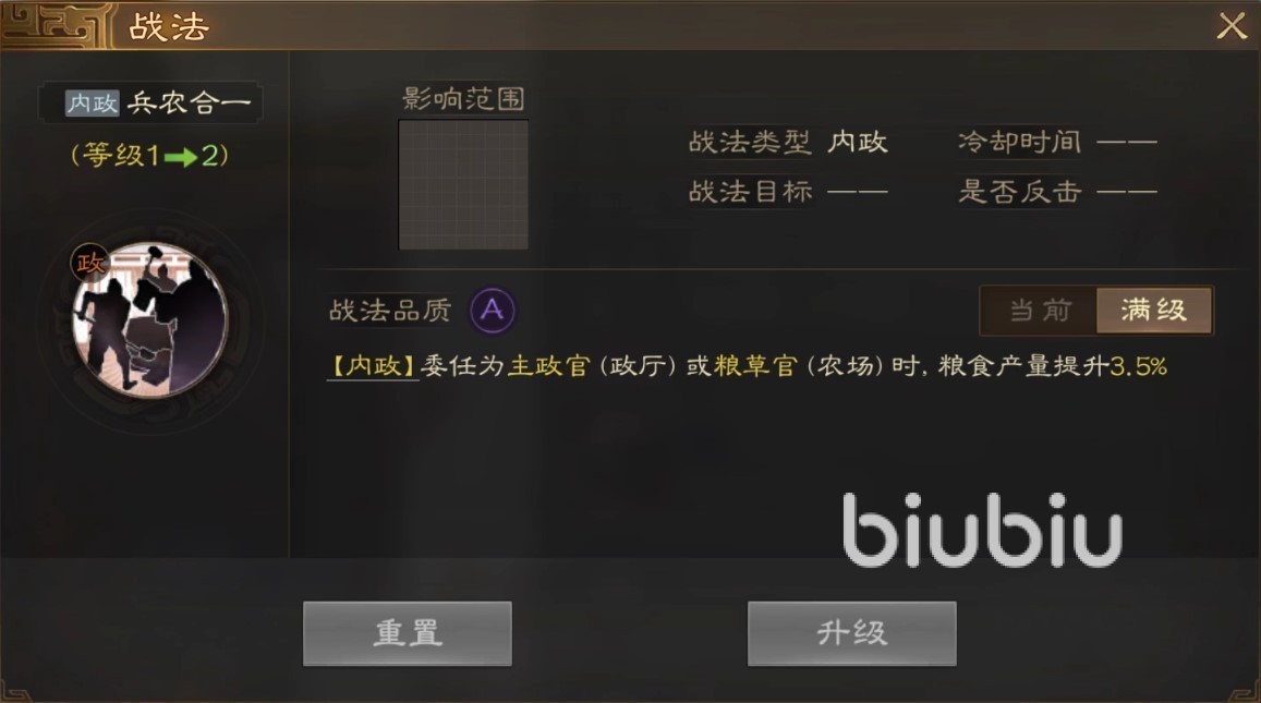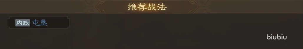 除了自带战法外,推荐再搭配一个蓝色战法“屯垦”来提高一点产量。除了战法,韩浩的特性也都是与内政相关的,将其放在对应的设施中可以提高全资源产量、粮食产量、铜币产量。