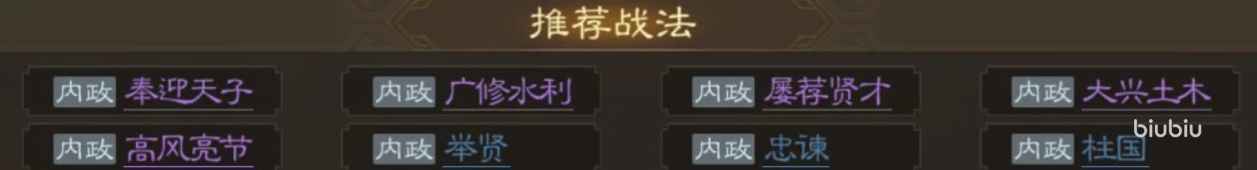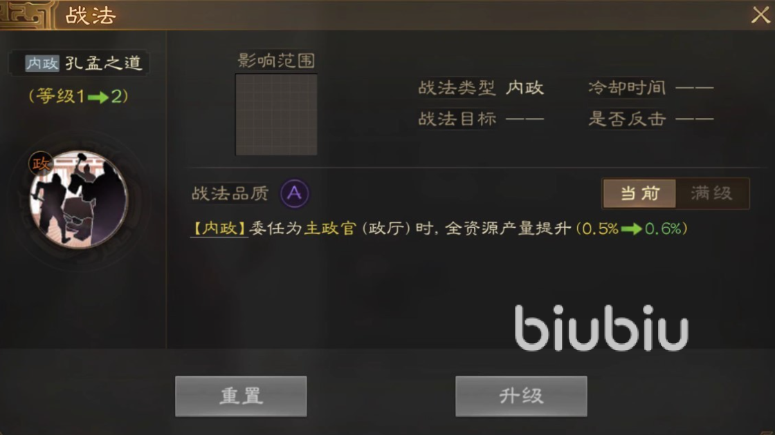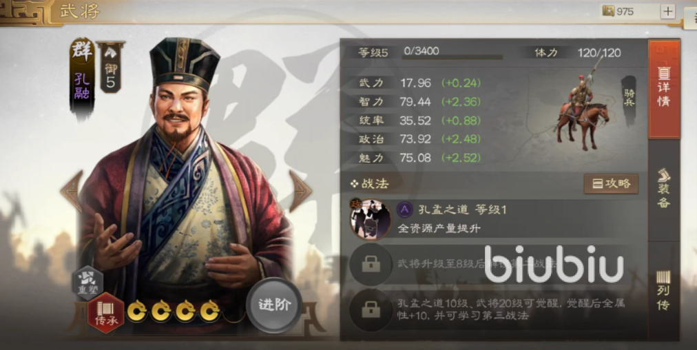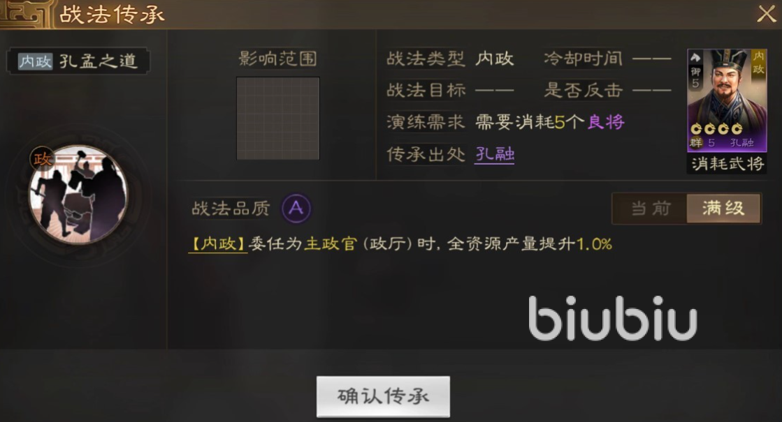 除武力值外的其他数值都还是非常平均不错的。孔融自带的战法名叫孔孟之道,这个战法主要作用于内政当中,玩家可以将孔融委任前往政厅发挥他的作用,提高我们游戏当中正在生产的资源产量。