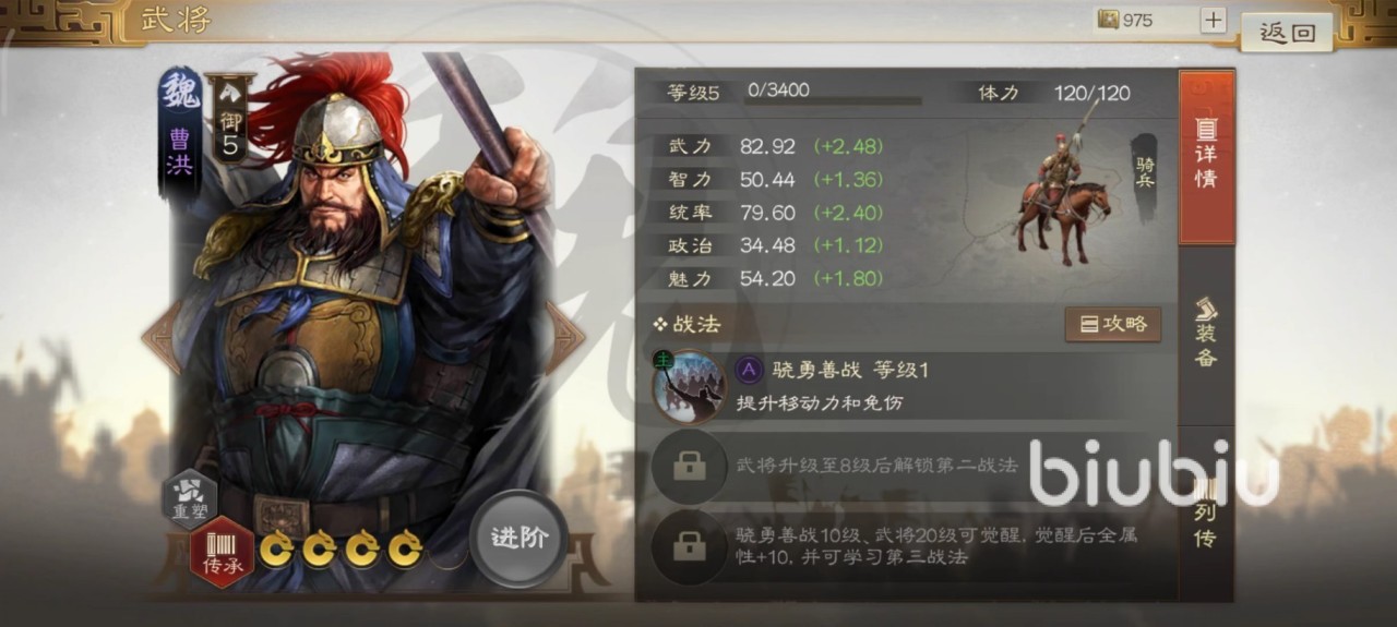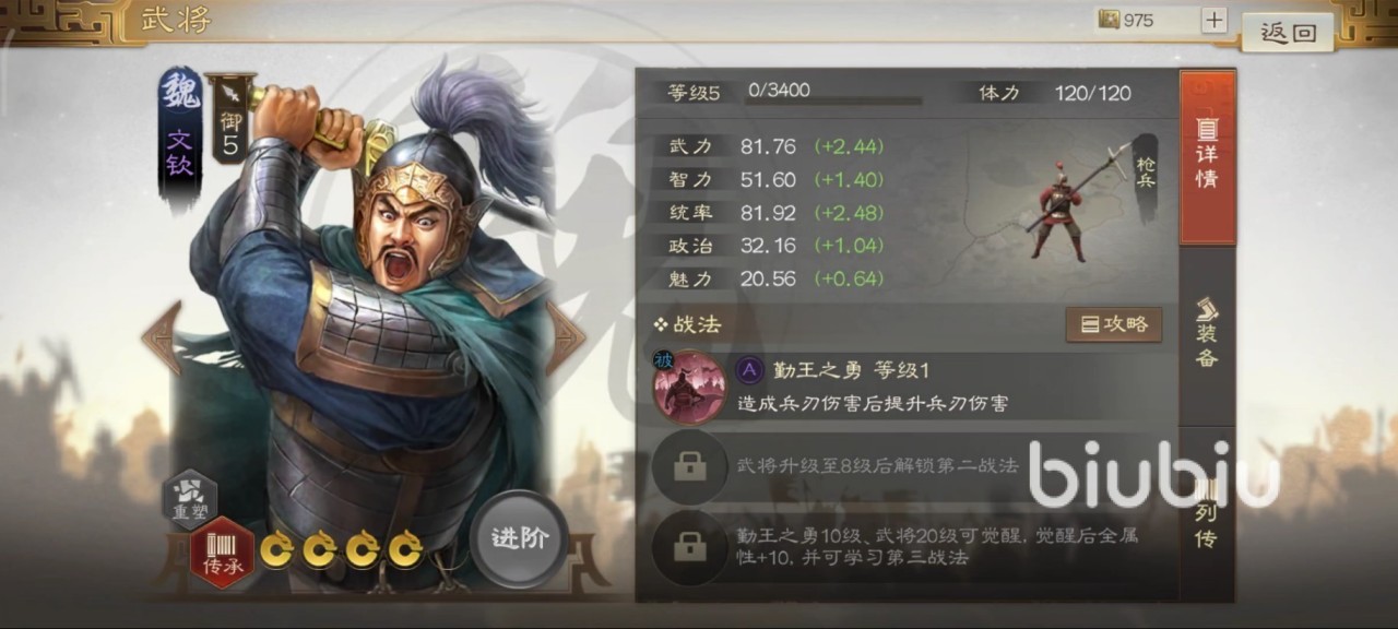 剩余2个位置,可以选择1骑或者1枪,外加1个辅助位。骑兵武将可以用曹洪、李通,枪兵武将推荐文钦、臧霸、文聘选其一,差距不是特别大。辅助位可选的不多,增伤用王异,加血用甄氏或者满宠。