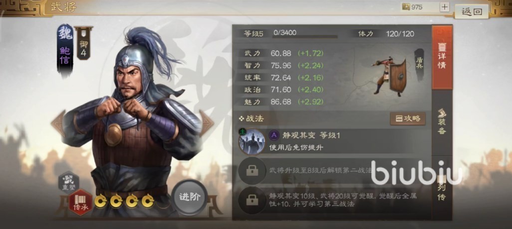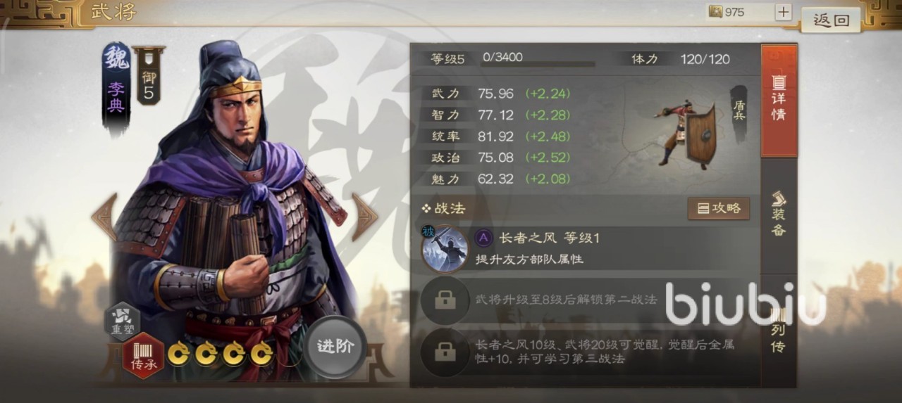 他的最大特色在于能强制敌将反向移动2格,当有敌方骑兵突入我方后排的时候,使用这个技能就能有效的对其进行限制,使其不容易近身。阵容搭配方面首先前排承伤位,推荐用鲍信和李典,前者有3回合的超级免伤(68%),坦度极高;后者能提升大范围内己方的武力与智力,这两位摆在前怕敌人难以轻易突破。