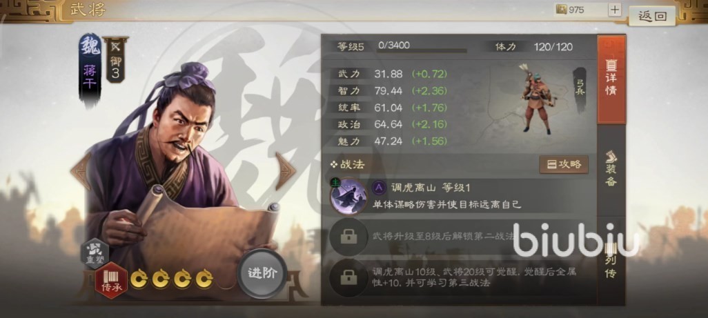 蒋干智力属性突出,又统率弓兵,后排谋略输出的定位其实也比较清晰了。其自带战法能够造成单体谋略伤害,并使其反向移动2格。自身也有小额免伤用来弥补在兵力上的数值低下。