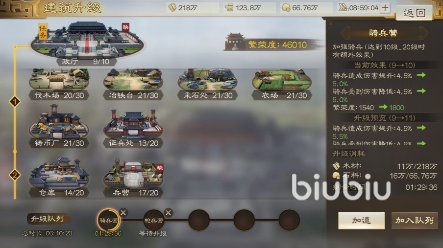 主城政厅升到三级以上,就可以开启造攻城武器和科技树玩法了,攻城武器主要用在攻城战中,科技则会全方位提高玩家的属性加成。然后再升一级就是各种武将培养功能,光靠打仗也太耗时间和精力,放在主城的演武场校场等地也可以以挂机形式慢慢升级。