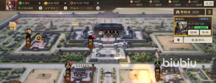 然后就是征兵了,士兵是军队的生命之源,你可以给自己拥有的每个武将分配兵力,兵力也就成了军队的生命条,兵力越高生命力越高。而城中的各类兵营会额外增加不同兵种的战斗力。