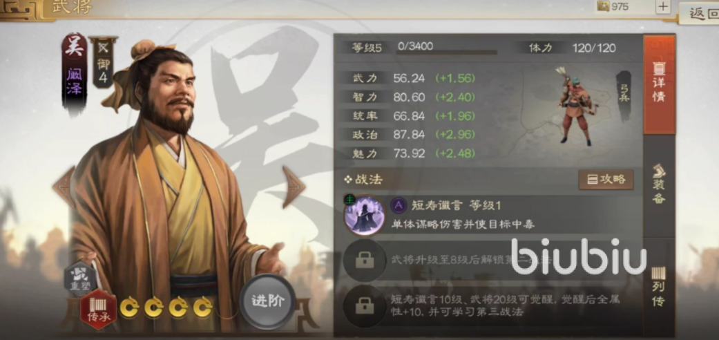 阚泽这个角色从属性来研究,智力和政治都是非常不错的,这就说明了这个角色在游戏战斗当中肯定是用智力来攻击敌人。作为吴国群雄阚泽这个角色除武力不太行以外其他属性都是非常均衡的,因此非常适合参与各类不同的战斗。