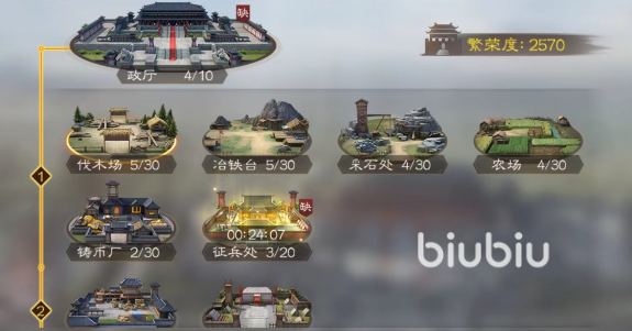 在之后利用这三个资源加成科技滚雪球,陆续建造升级农场、铸币厂、征兵处等,一点点按顺序建造,繁荣度就会越来越高资源也会越滚越多。
