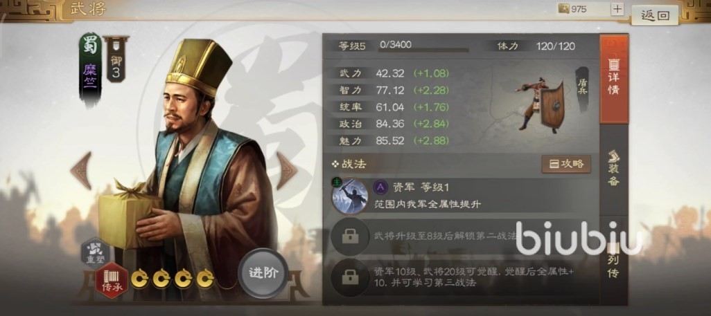 游戏中的糜竺统率盾兵,算是个前排,但武力方面并不出突出,主要是在智力、政治以及谋略这三方面有着较高的属性。自带兵法能够提升以自身为中心的两格范围内我军的全属性40%,这个提升幅度相当高。再加上一些特性,还能获得高额的智力加成,同时每偶数回合还能驱散灼烧状态。