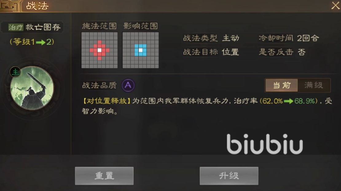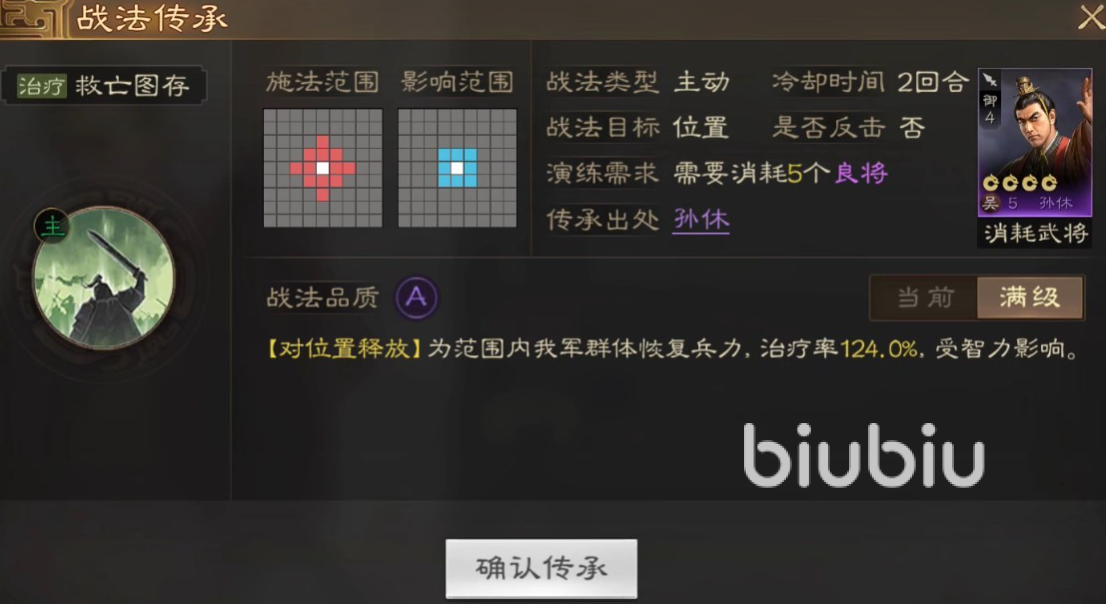 孙休的自带战法品质也是非常高的,主要的作用就是在战斗当中为我方的军队恢复兵力,并且治疗的能力最高可以达到百分之六十二,随着战法等级的提高那么治疗率也会越来越高。